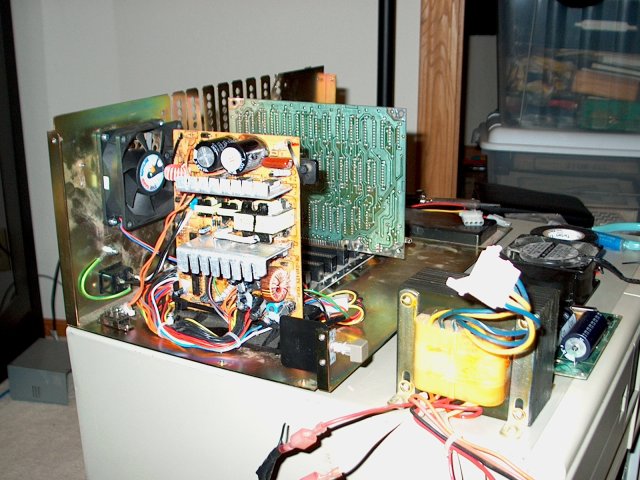 the way to the floppy bay. You can see, in front of the case, the old fan, power supply board, and transformer.